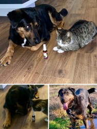 Mijn naam is Nelly en ik ben al 6 jaar oud. De kat op de foto is mijn maatje (woont ook bij ons). Ik heb dit jaar een vreselijke ervaring gehad, ik stapte in een nest teken. Ze zaten overal in mijn nek, op de ballen van mijn voeten en het jeukte overal. Mijn bazin leerde Anizeck tekenwerend middel kennen via haar vriendin. Ze brengt het vroeg aan op mijn nek en achterpoten en daar doe ik de hele dag mee. Behalve als we het bos in gaan, dan herhaalt ze het insmeren voordat we vertrekken. Het gras staat momenteel erg hoog (voederweide) maar er zijn geen teken te bekennen. We gebruiken het nu ongeveer 6 weken met succes en hebben er alle vertrouwen in dat de kleine bloedzuigers in de toekomst uit onze buurt zullen blijven.